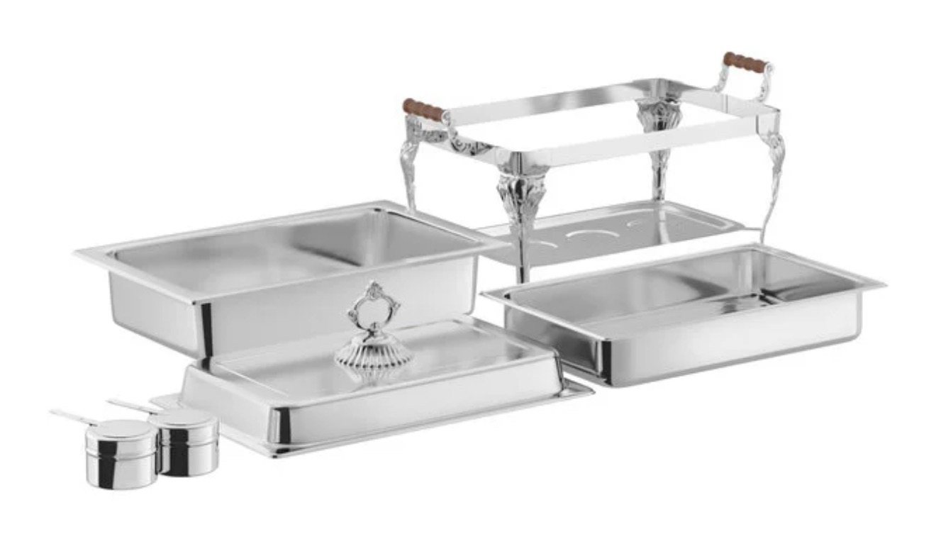 Durable corrosion-resistant stainless steel dish with mirror finish. Stylish lid handle for aesthetics and safe access to the food. Elegant beveled legs for optimum stability.