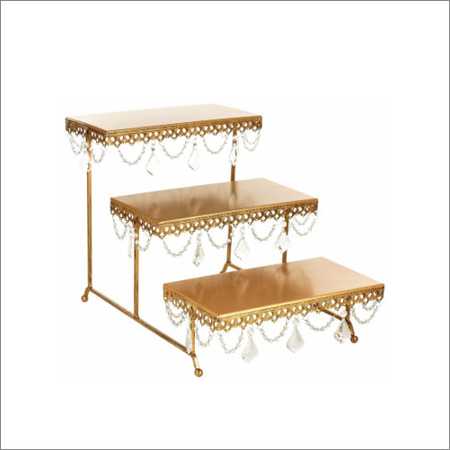 Gold 3 Tier stand with Crystals. The diameter of each layer is 7.5″ long by 14″ wide. The entire stand is 15 inches tall and weighs approx. 8 pounds